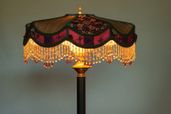 All shades are hand stitched, recent shades feature crystal beading and are paired with hand tinted vintage lamps.